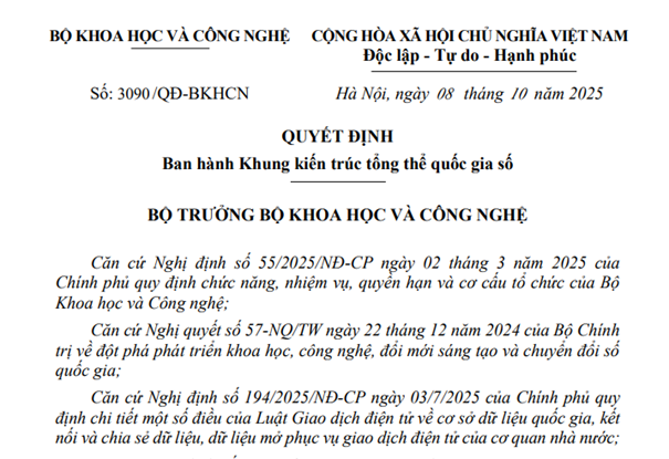 Ngày 08/10/2025, Bộ trưởng Bộ Khoa học và Công nghệ đã ban hành Quyết định số 3090/QĐ-BKHCN ban hành Khung kiến trúc tổng thể quốc gia gia số. Quyết định này có hiệu lực thi hành kể từ ngày ký và thay thế Khung kiến trúc tổng thể quốc gia số (Phiên bản 1.0) được Bộ Khoa học và Công nghệ ban hành tháng 5 năm 2025.